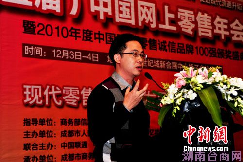 12月4日,在成都举行的第五届中国网上零售年会上,台北市消费者电子商务协会理事、网劲科技CEO游士逸在演讲中表示,互联网世界唯一的国界是语言。英文过去是第一市场。但华人在全世界分布广泛。台湾正在推动华人电子商务市场行动计划。两岸共同的文字、语言、文化背景正是电子商务合作的前景。两岸将有机会打造以华人语言为交流工具的“华人独有的电子商务市场”。图为游士逸在年会上发表演讲。中新网发 安源 摄