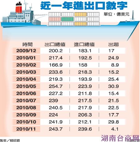 据报道,“统计处”昨天公布进出口资料,“统计长”林丽贞说,11月出口金额243.7亿美元、进口金额239.6亿美元,都是史上单月第3高。