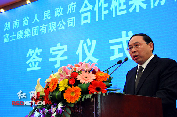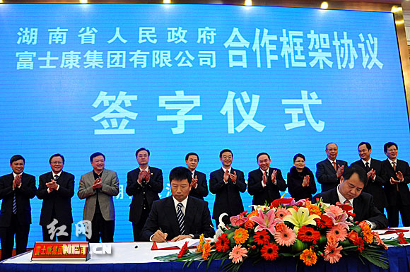 今天,湖南省人民政府与富士康合作框架协议签字仪式在长沙举行。