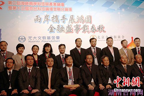 12月13日,百余位北京市和台湾金融业界人士在台北展开交流,各自介绍金融市场发展现状,展望后ECFA(海峡两岸经济合作框架协议)时代两岸金融交流合作新局,探讨合作契机。中新社记者 黄少华 摄 12月13日,百余位北京市和台湾金融业界人士在台北展开交流,各自介绍金融市场发展现状,展望后ECFA(海峡两岸经济合作框架协议)时代两岸金融交流合作新局,探讨合作契机。图为与会两岸金融业者合影。这场题为“后ECFA时代,两岸金融业的发展策略与合作契机”的交流,是第3届海峡两岸科技与产业论坛暨第13届京台科技论坛金融分论坛,是京台金融业界在台湾的大盛会。
